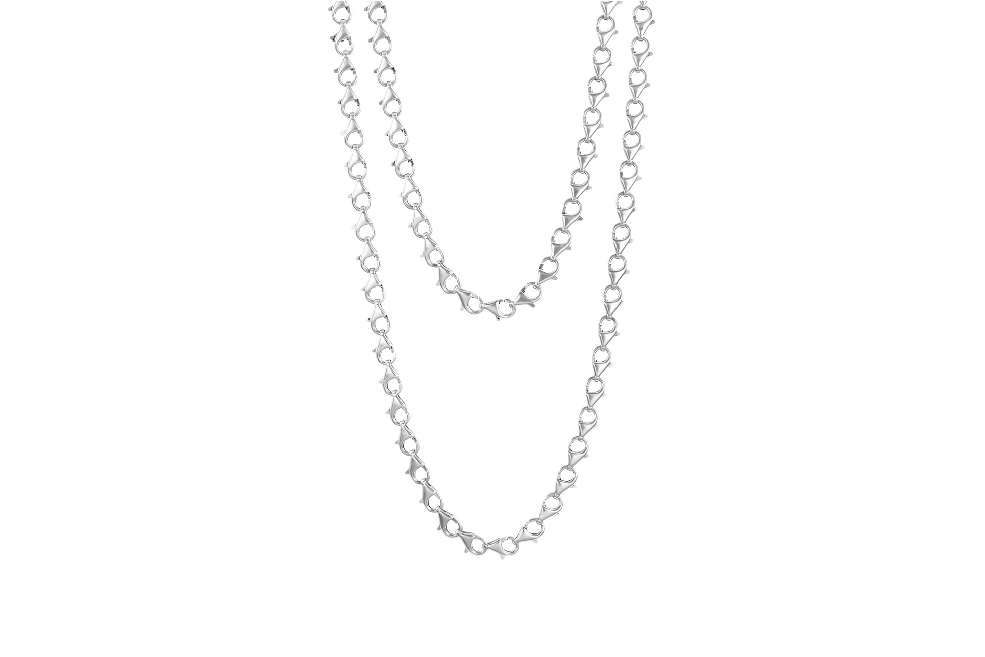 This chain of oversized lobster clasps can drape as a necklace, cinch as a belt, or elevate a handbag as a statement strap. Boldly constructed with raw elegance, it turns utilitarian hardware into high fashion.