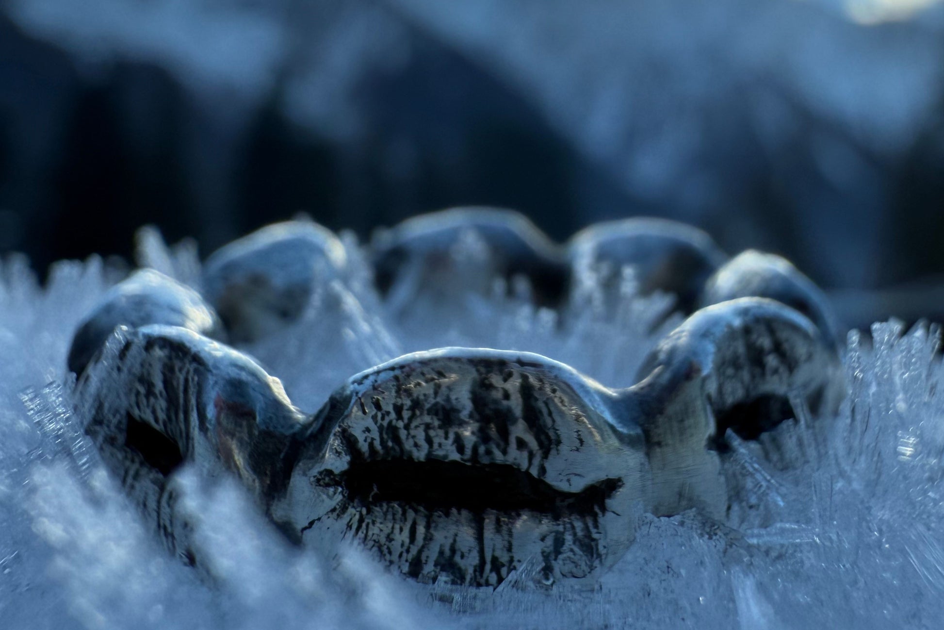 Cast, oxidized coffee beans soldered all around the finger, facing outward.