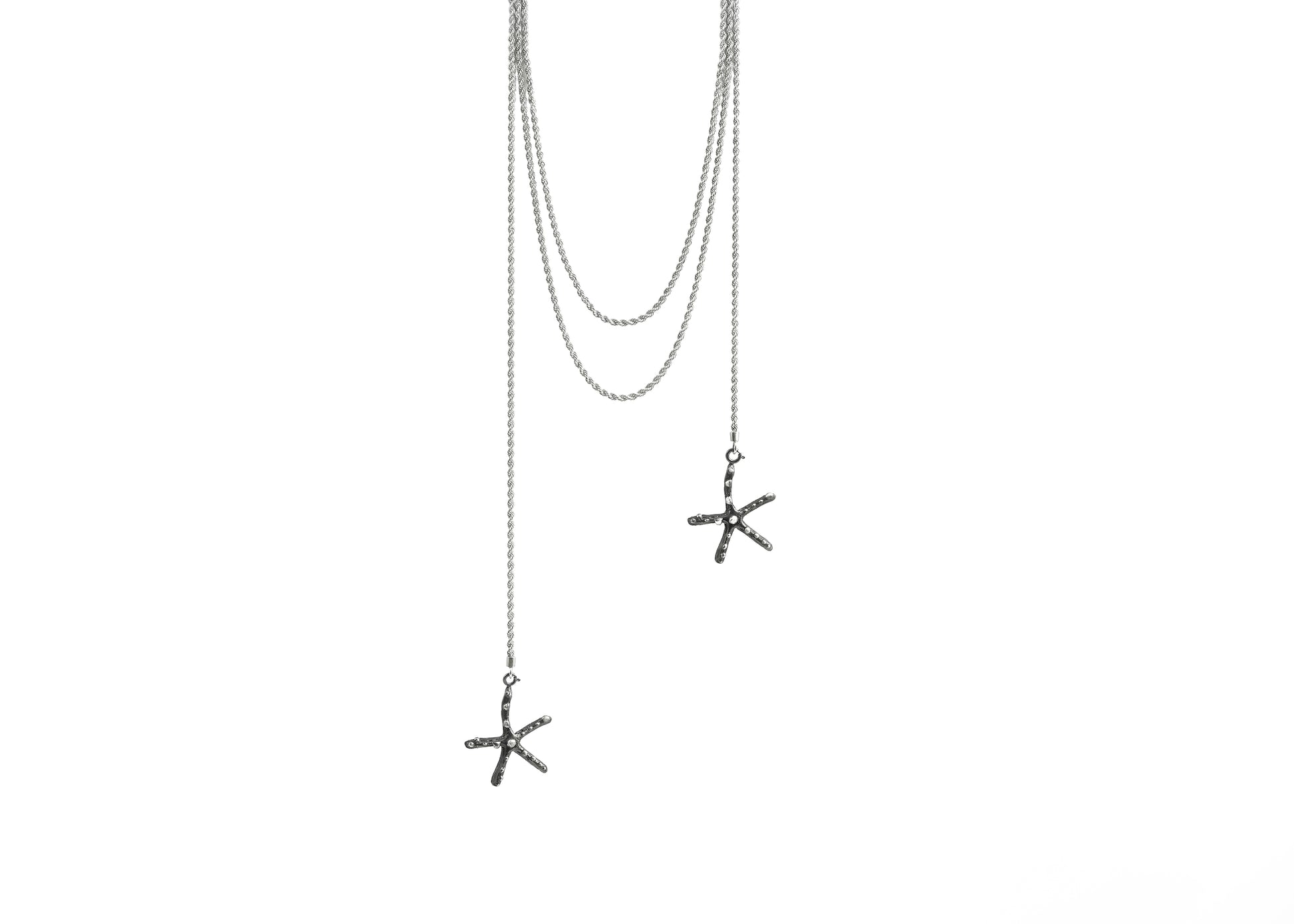 Handcrafted, two oxidized starfish anchor each end of a long, silver rope chain. Wrap it around your neck once, twice, or more — forward or back. Fluid and sculptural, it’s a piece that moves with you.